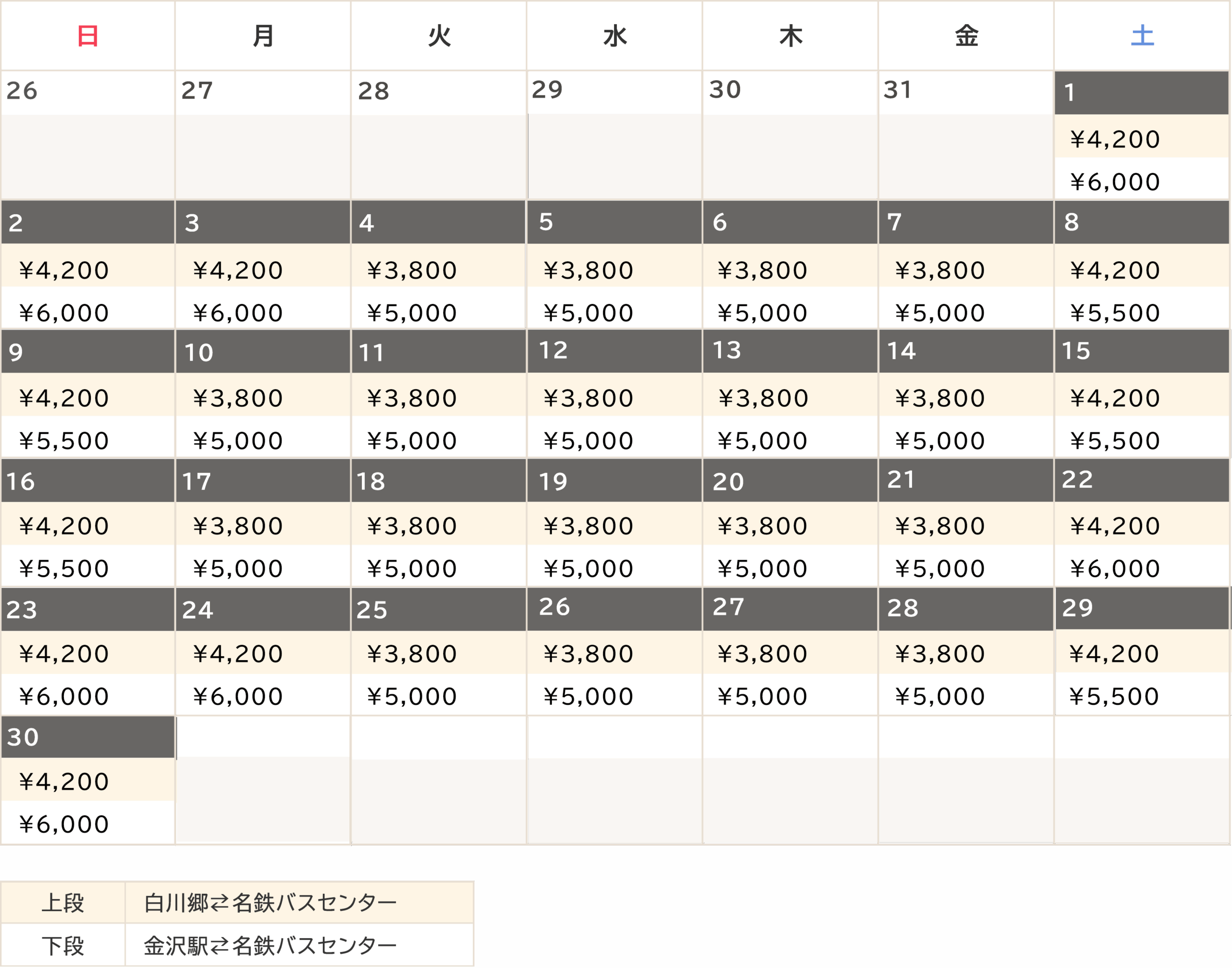 「金沢駅-名古屋」間および「白川郷-名古屋」間はカレンダー運賃