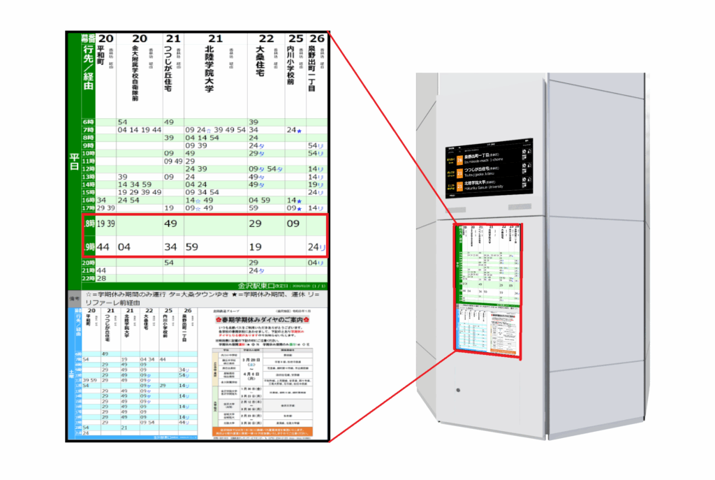 金沢駅東口バスターミナル、香林坊(アトリオ前)、香林坊アトリオ(1階アトリオステージ付近)、金石バスターミナルにデジタルサイネージを設置しました。