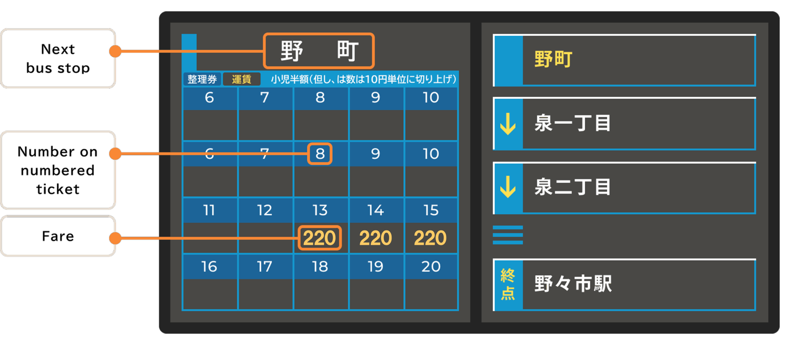 Fares are shown on the display at the front of the bus, under numbers corresponding to numbered tickets. Child fares (for children 6–12) are half the adult fare, rounded up to the nearest ¥10.