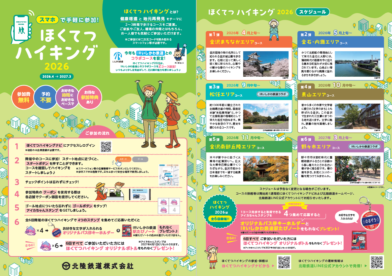 アイカちゃんスタンプをGETしましょう。 - 全6回開催のほくてつハイキングで4つのスタンプを集めてご応募いただくと、お好きな文字が入れられるオリジナルバス停キーホルダーとIRいしかわ鉄道駅たびノートをもれなくプレゼント♪