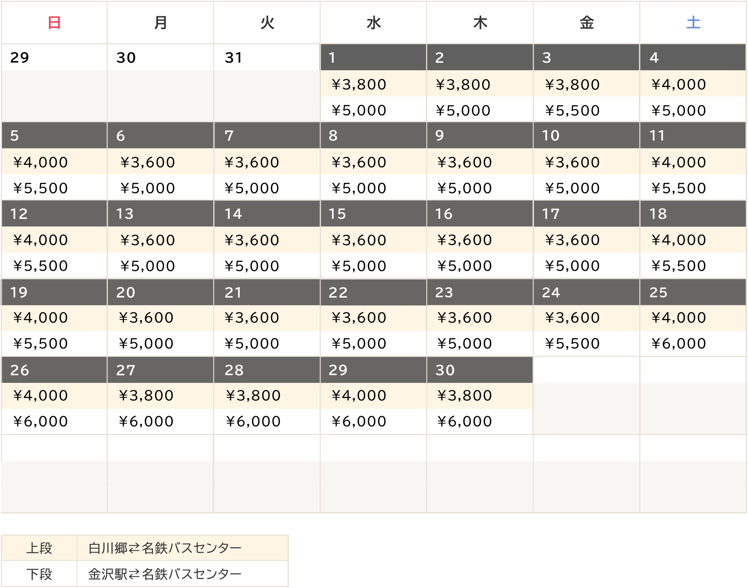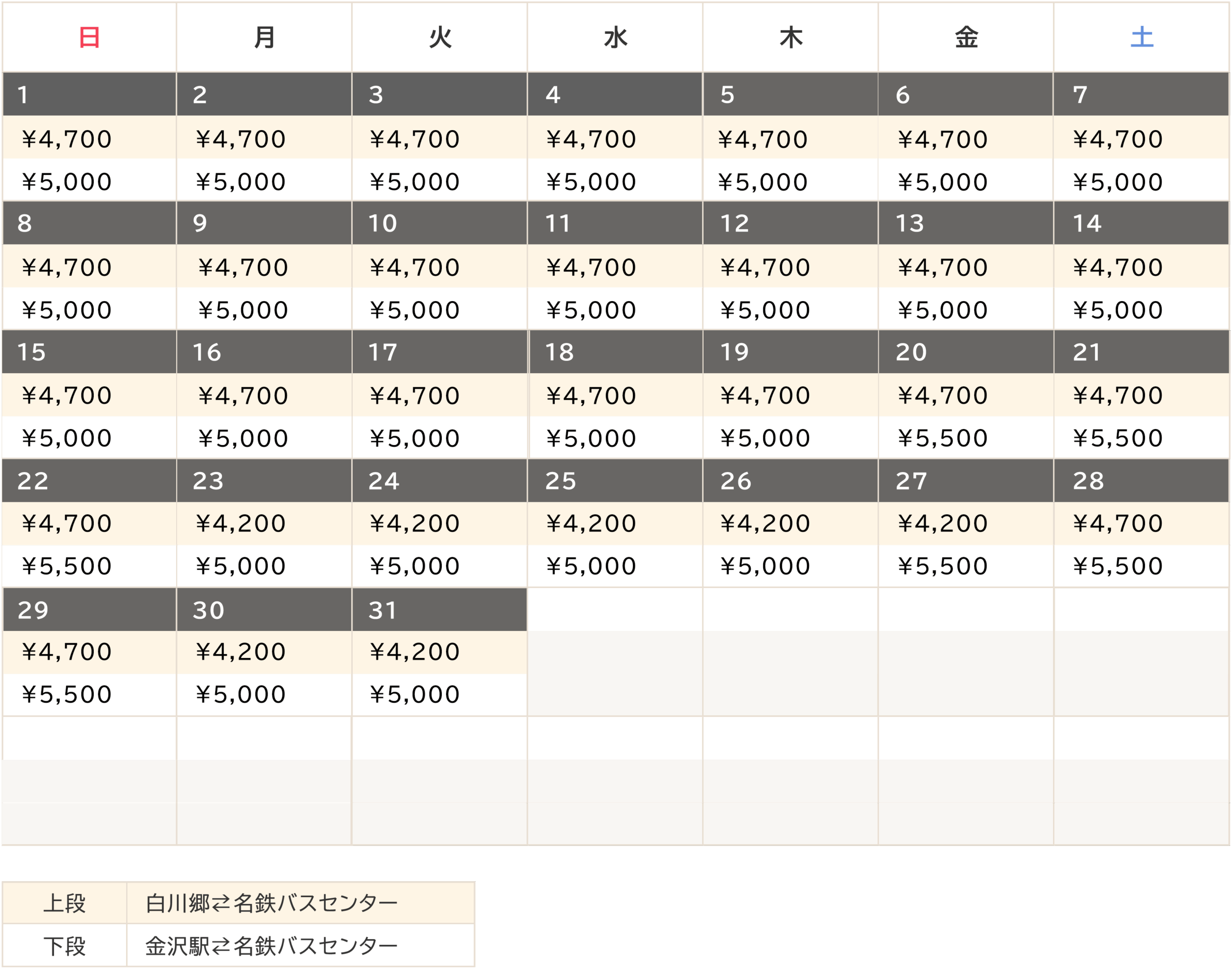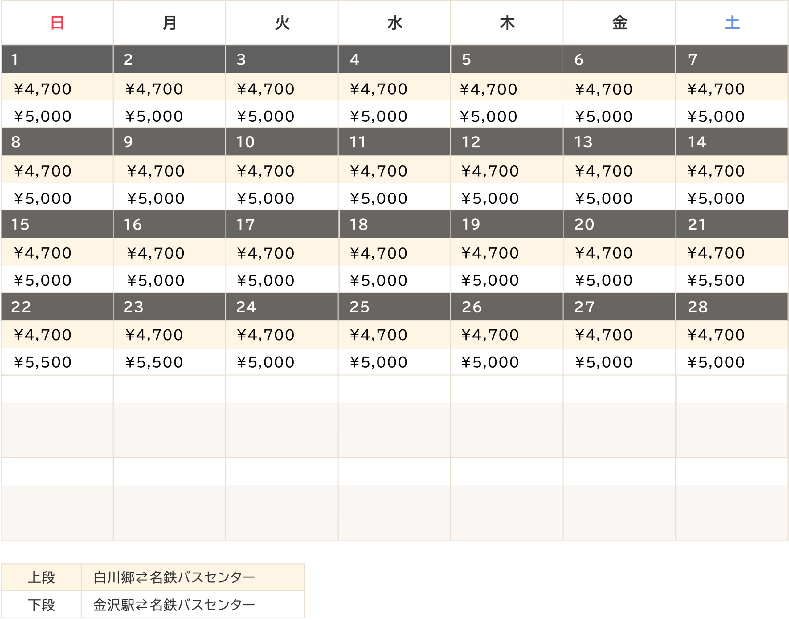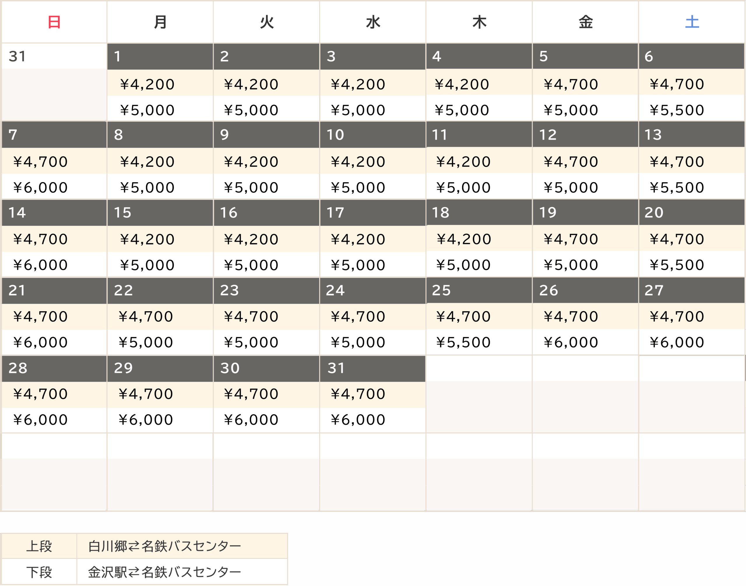 | 白川郷↔︎名鉄バスセンター | 3,600円〜4,700円 |