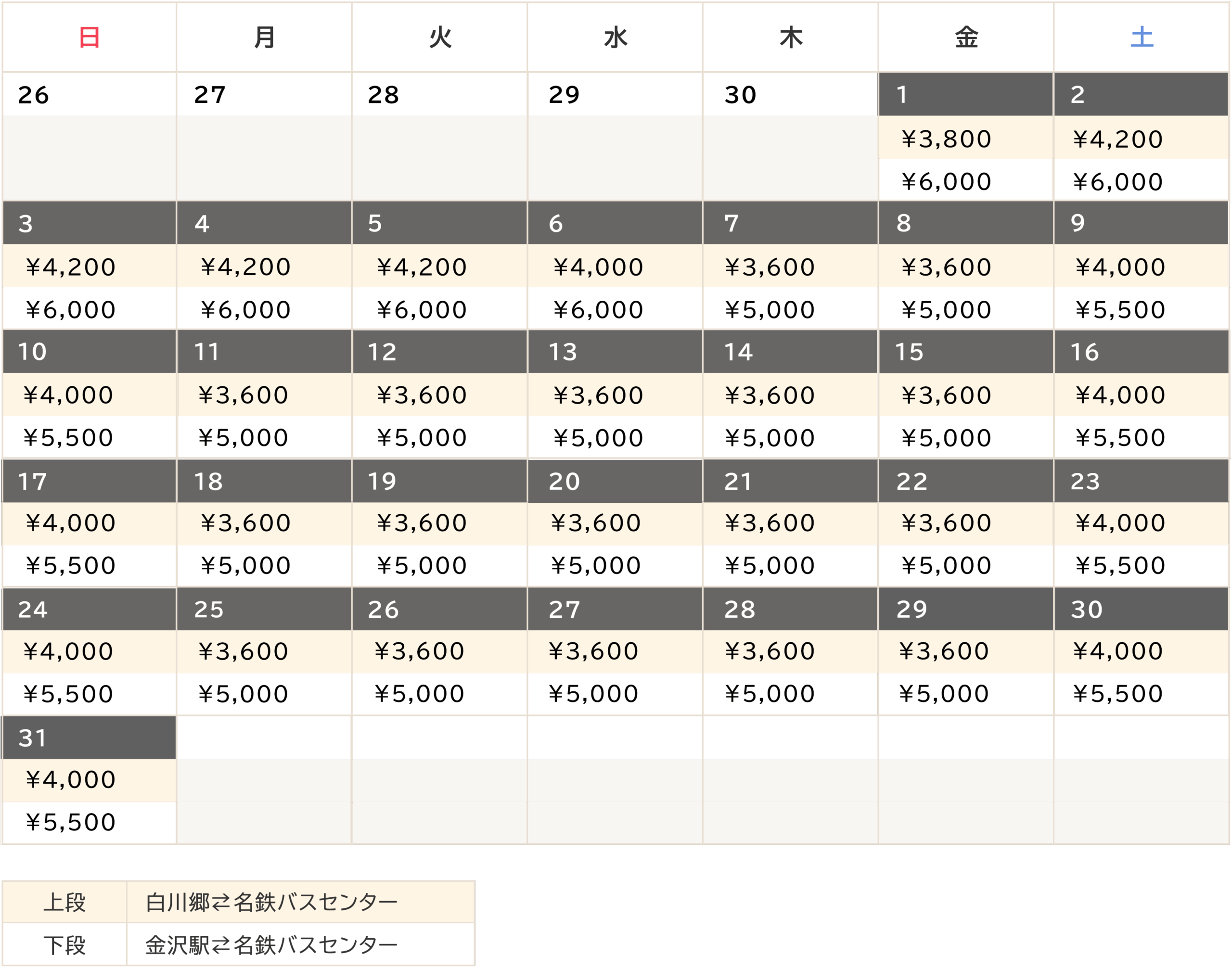 | 白川郷↔︎名鉄バスセンター | 3,600円〜4,700円 |