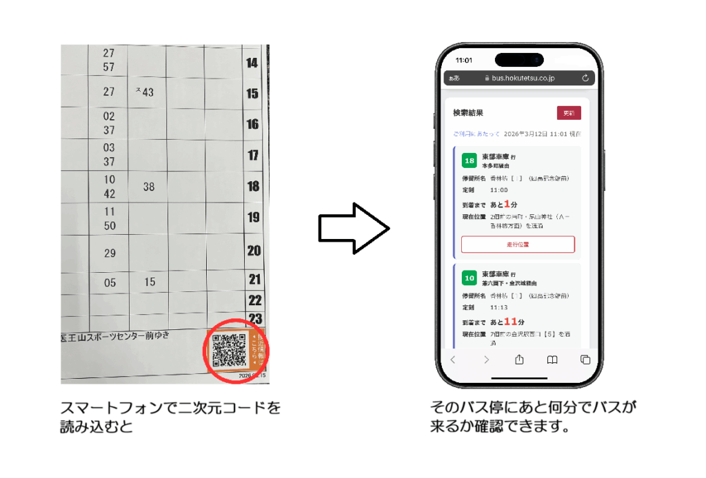 スマートフォンで二次元コードを読み込むと、接近情報ページにリンクし、そのバス停にあと何分でバスが来るかが確認できます。バス待ちの際にぜひご活用ください。