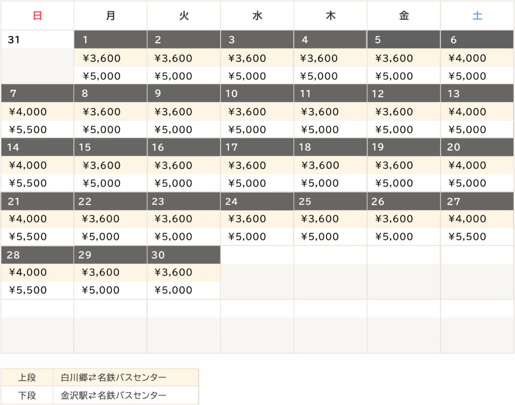 高速白川郷・名古屋線のカレンダー運賃について(2026/6/1~2026/6/30)