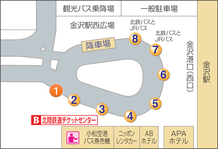 金沢駅西口①のりば 9:40~17:20まで約20分間隔で運行(毎時00,20,40分発)