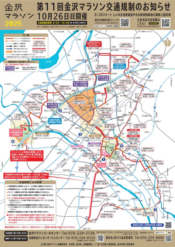 2025年10月26日(日)6時~17時にかけ、金沢市内における多数の区間において、通行止め規制が生じます。規制の詳細につきましては金沢マラソン公式サイトをご覧ください。