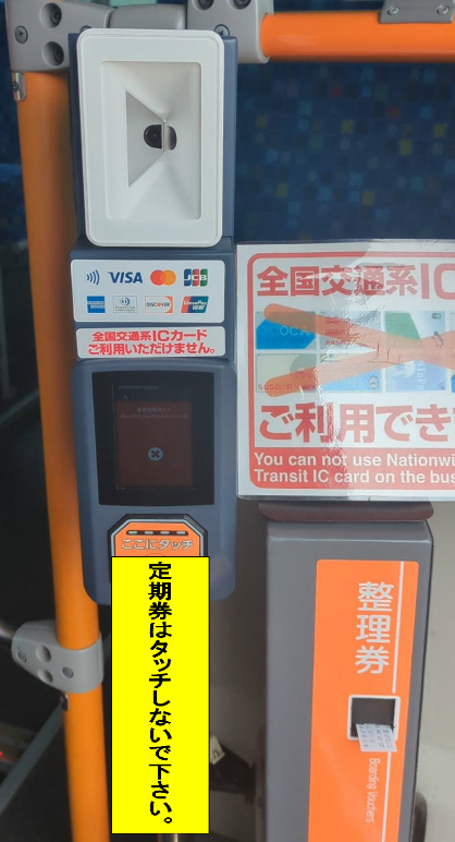 入口に下図のような案内が出ている場合、定期券をお持ちの方は乗車・降車ともにタッチせず、降車時に乗務員まで定期券をご提示ください。