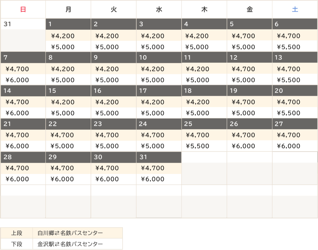 | 白川郷↔︎名鉄バスセンター | 3,600円〜4,700円 |