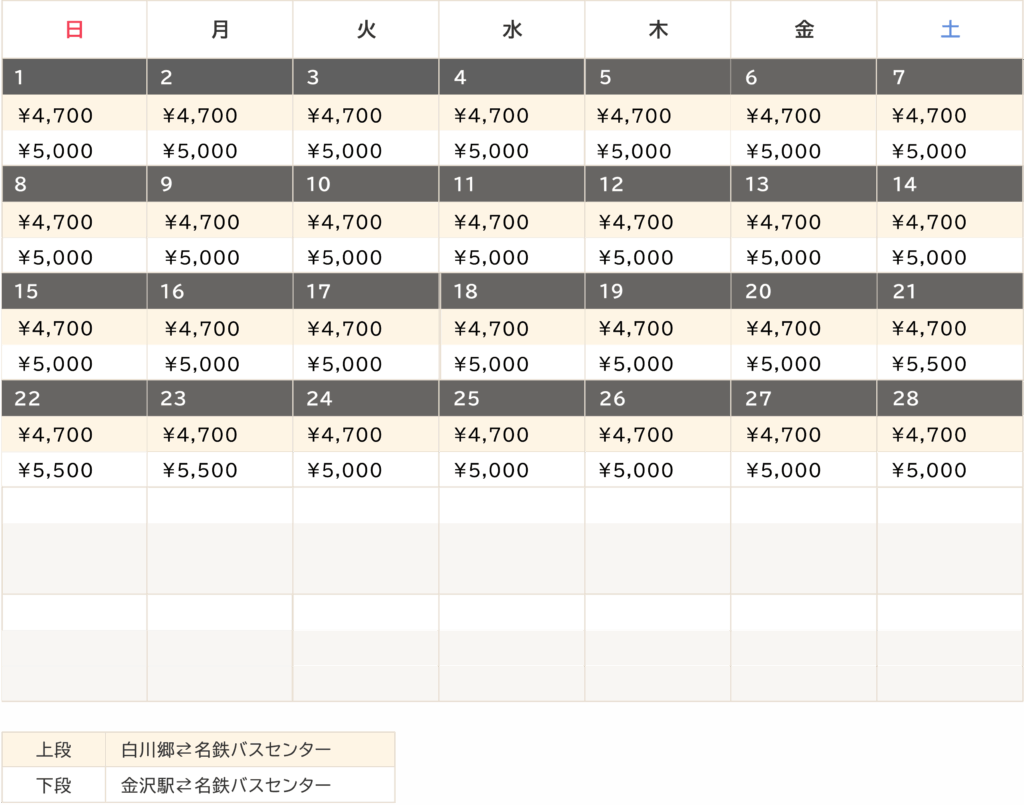 高速白川郷・名古屋線のカレンダー運賃について(2026/2/1~2026/2/28)