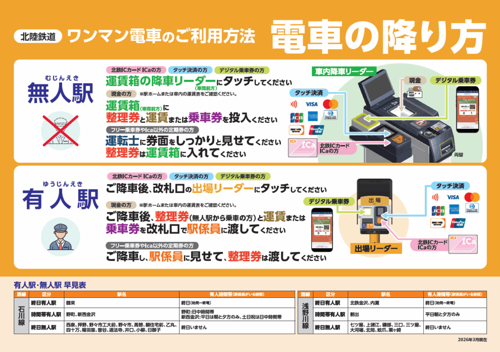 | ご利用になれる列車 | 石川線(野町駅・鶴来駅) <月~金曜> (下り)野町発 9:38~15:38 までの列車 (上り)鶴来発 9:38~15:19 までの列車 <土・日・祝日> 始発~終電まですべての列車でご利用いただけます。 浅野川線(北鉄金沢駅・内灘駅) <月~金曜> (下り)北鉄金沢発 9:01~15:30 までの列車 (上り)内灘発 9:01~15:30 までの列車 <土・日・祝日> 始発~終電まですべての列車でご利用いただけます。 |